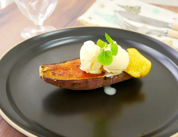 ハーフサイズの焼き芋を丁寧にブリュレ。