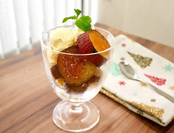 食べやすいサイズに切った焼き芋ブリュレをサンデー風に仕上げる。お好みでバニラアイスや、さつまいもチップスを入れて食感の変化を楽しんでもGood
